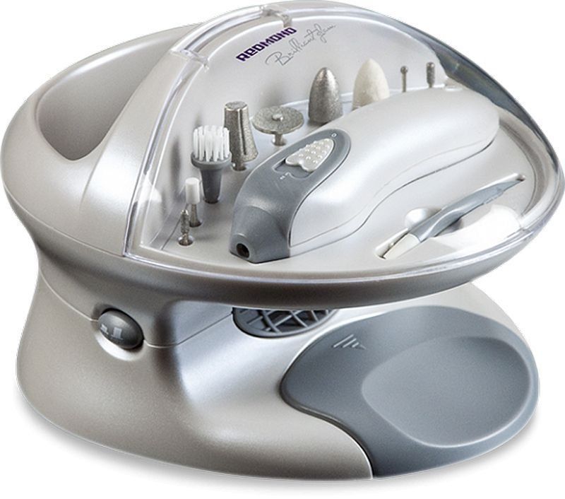 The Redmond RNC-4901 model is very popular. With this manicure set, you can forget about the beauty salon, creating it at home. The white plastic case contains 9 attachments, cuticle sticks, a hand bath with a jacuzzi for fingers, a compartment for air aromatization and a dryer with a UV lamp. The device has two speed settings. The device is comfortable in the hand. Power comes from the network or using a battery. The total uptime is 2 hours at speed 2 and 3 hours when using speed 1. The total weight of the set is 1 kg. An ultraviolet lamp is used to disinfect, not suitable for drying gel polishes.
