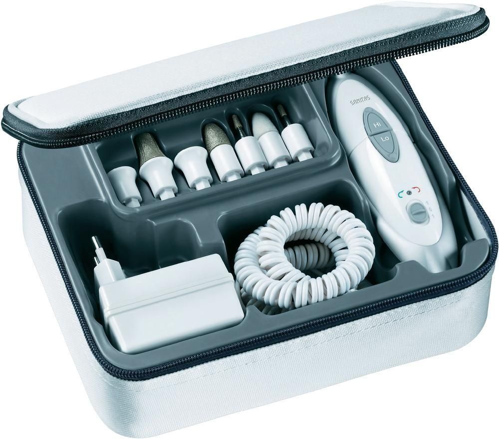 The Sanitas SMA35 model is an electric kit designed for hands and feet. The device operates from a 220 V network, there are two options for rotation speed. The package includes a storage case, instructions in Russian, 7 nozzles with a sapphire coating and a spatula with which to separate the cuticle. The speed of rotation of the nozzles varies from 2800 to 4600 rpm. With the help of these tools, it is easy to carry out impeccable self-care.