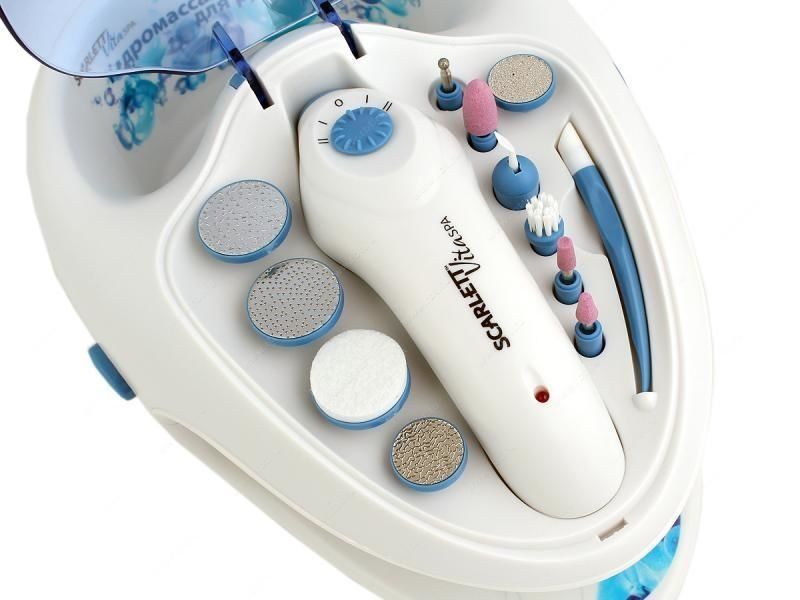 Model Scarlett SC-MS95005 is perfect for manicure and pedicure. Power type - from the network. Comes with 11 tourmaline tips, hand bath, mains adapter, tip holder and built-in nail polish dryer. The rotation of the nozzles can be in two directions. Power 240 W. The body of the base is made of plastic, on the sides there are a couple of buttons and an input for a plug. The set weighs 810 grams.