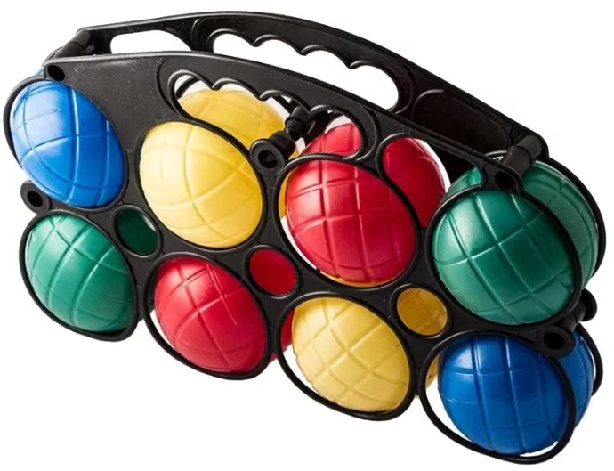 Under the trademark "Evrika" a children's petanque set of 6 balls is produced. Their main feature is that they are soft - they have sand inside. Their diameter is 9 cm, the kochonette is 4.5 cm. There are 2 colors in the set - half of the shells are silver, half are black. The set is designed for children over 7 years old. The kit also includes a zippered carrying bag and a measuring tape.