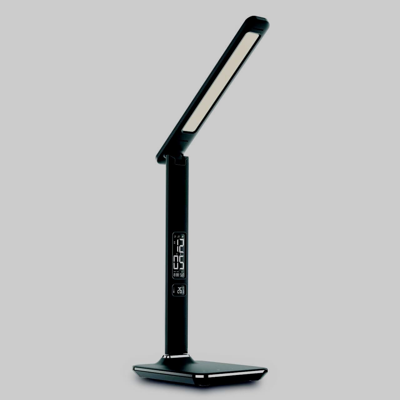 A beautiful lamp on a steady supply. The height of the base is adjustable. You can select a point of illumination and send a stream of bright light there. The device supports three color temperature modes: 5500 K, 4200 K and 3000 K. The manufacturer equipped his offspring with a USB charging port. Infrared and ultraviolet rays are not used in the model. There are also no hazardous substances that can harm the health of the master and the client. The design has a positive effect on vision, removes fatigue. There is a liquid crystal display, a thermometer, a calendar and an alarm clock.