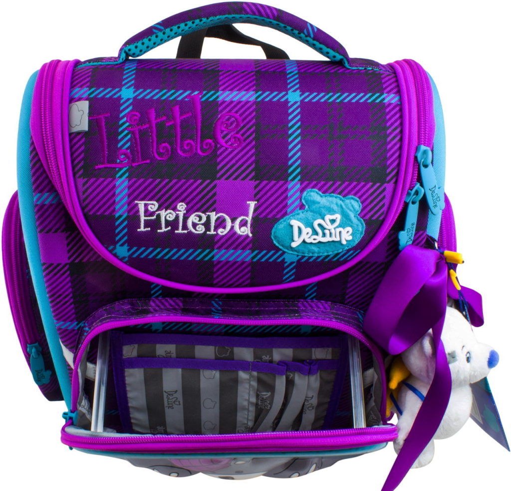 Backpacks for girls, in addition to a change bag, have a hair ribbon and a keychain in the form of a teddy bear. And for boy models, a pencil case and an electronic watch are additionally provided.