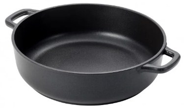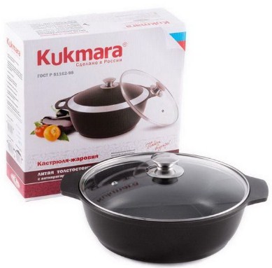 In the manufacture of this product, the method of chill casting was used. KUKMARA is a reliable cookware with good capacity. This means that when cooking, food will not fall out over the sides and it will not have to be constantly “caught”. Also, the manufacturer separately notes the excellent thermal conductivity and strength.