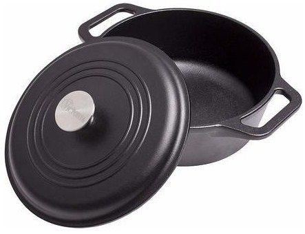 A practical hardened cast iron frying pan that is suitable for cooking on any stove and even outdoors.