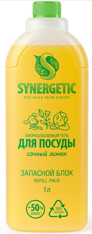 The refill bottle made of transparent plastic contains a thick yellow concentrate. Features: lemon scent, antibacterial properties, works in cold water, suitable for sensitive skin, completely rinses off surfaces, biodegradable.