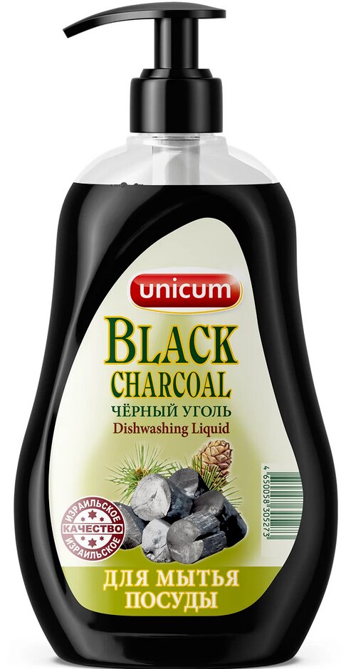 Differs in black color, structure (charcoal of coniferous breeds).Transparent plastic bottle has rounded sides, black dispenser.