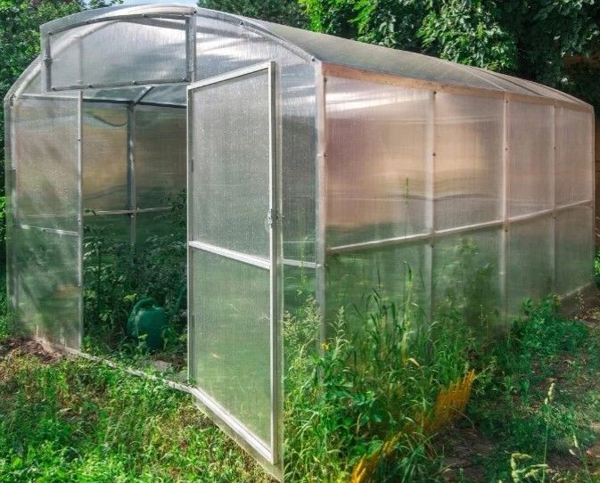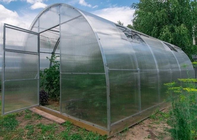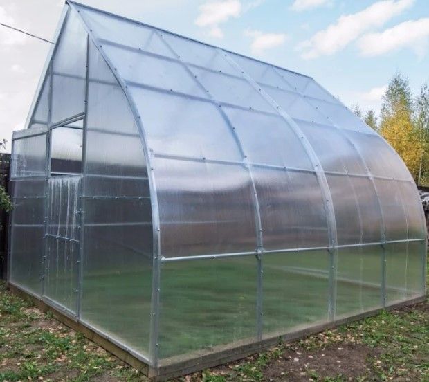 The greenhouse has won a special place in the hearts of summer residents of Russia for its high strength: the domed roof not only helps to roll the snow cover off the structure, but can also withstand up to 280 kg per 1 m2. The basis of the frame is a metal profile 60x20 mm with galvanization, the wall thickness of the profile is 1 mm, which allows you to maintain a balance of strength and weight of the structure.A door is installed at each end - to get into the greenhouse, you do not need to go around it, and if the weather does not allow you to open the doors, there are vents to ventilate the building. The width of the structure is standard 3 meters, and the length can be chosen - available in lengths of 4, 6 or 8 meters.