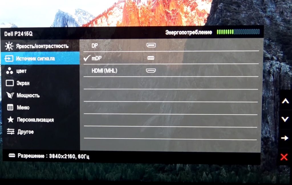 All exits are located on the right side. The power supply is built in. Video inputs: DisplayPort 1.2; HDMI 1.4; serviceport. There is a headphone output Audio-Out (3.5 mm), Audio-In (3.5 mm), 4 USB 3.0. There is no HDMI cable included. The language in the settings changes to Russian, there are several modes.