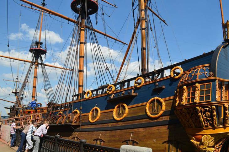 An amazing museum afloat, a passenger ship of the time of Peter the Great, its length is more than 30 m. This is the prototype of the battleship of the Russian Navy "Goto Predestination", designed by Peter the Great. The first voyage took place in 2014 and although the ship has sails, it is thanks to the diesel engine, reaching a speed of 12 km/h.