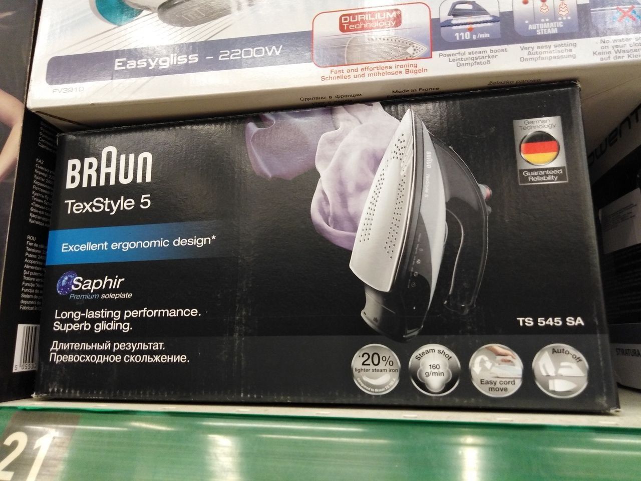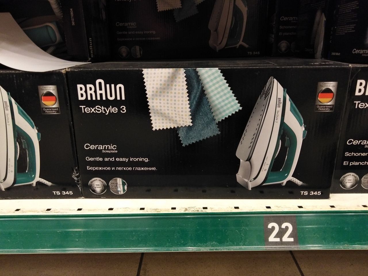 The TS 345 model is similar in many respects to the one considered earlier, but is noticeably simpler in terms of technical characteristics and more affordable. The power of the iron is good - 2000 W, but the steam consumption is the same as that of the previous model 25 grams per minute, the steam boost is weaker - 100 grams per minute. There is an iron in the region of 2000 rubles.