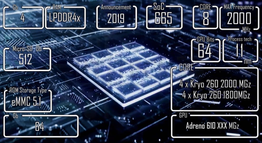 | Chipset | Qualcomm SDM665 Snapdragon 665 (11nm) | |||