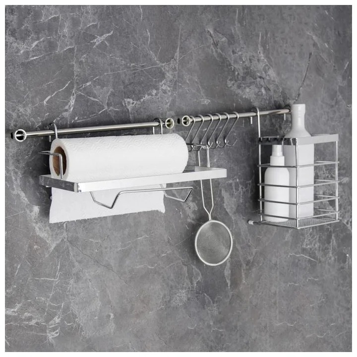 They are found in almost every home and are indispensable for various small items, bulk products and small inventory. A decorative load is also performed by sets of steel or plastic hooks, devices for various small parts, such as a holder for drying towels. Such structures are mounted above the stove itself, giving the kitchen complex a harmonious appearance as a whole.