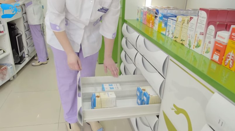 In pharmacies, there is a convenient display form that allows visitors to move freely from one showcase to another, independently filling the basket with goods and paying at the checkout in cash or with a bank card. On all emerging issues in the trading floor will consult the pharmacist on duty.