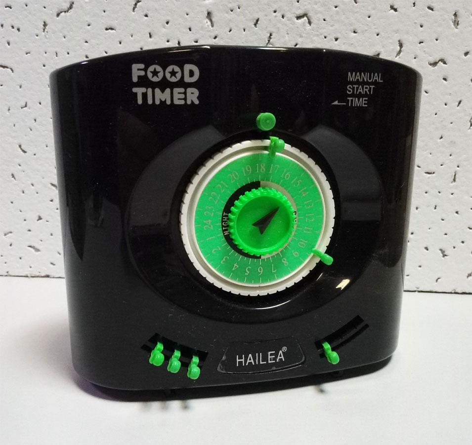 A special dial allows you to set the required time for the issuance of the next portion. The device works from finger batteries.