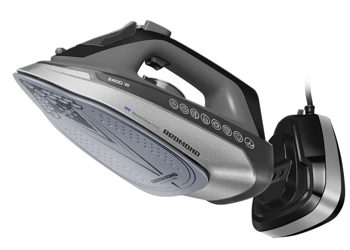 Such a device from the Redmond company is not just an iron, but a 3D iron that has many functions. Its main feature is the ability to use it both with a wired connection to the network, and wirelessly using a charging stand.This feature makes it easy to iron both bed linen and clothes with many elements where you need to turn the device in different directions.