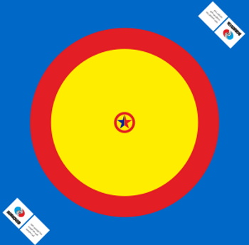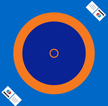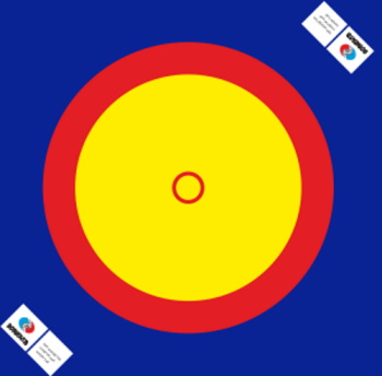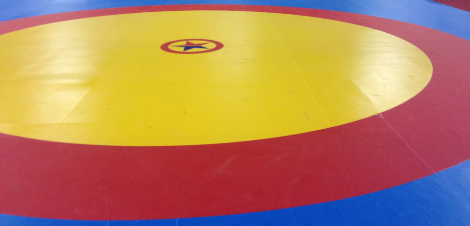 Three-color wrestling carpet of Russian production for use in wrestling gyms, martial arts tournaments and for MMA. The kit consists of a matt PVC coating with a density of 650 kg/m3 eight by eight meters and a set of non-crosslinked PES mats one by two meters five centimeters thick. Fastening can be grommet or using pockets.