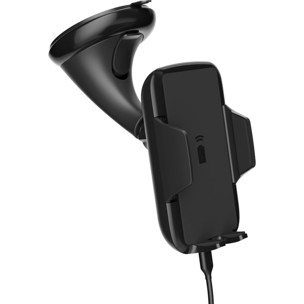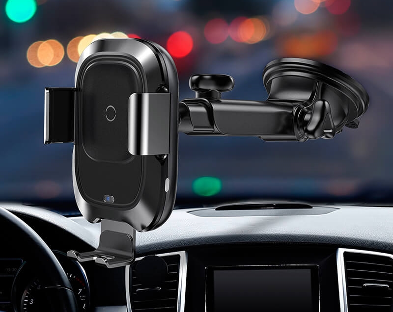 Charges your phone wirelessly. The device is fixed by one of the options - using a suction cup or a clamp. You can install the device on the dashboard or on the air duct grille. For the manufacture of the body of the model, durable high quality plastic is used. The design of the holder is equipped with a swivel mechanism and an extension rod.