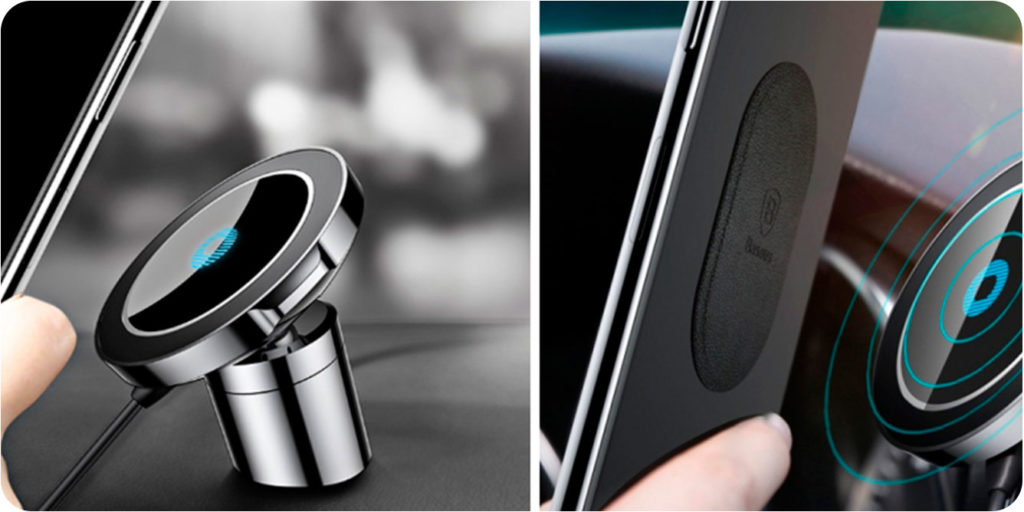 The holder has a round base plate and a leg. It can be glued to a torpedo or fixed to a ventilation grill with a clip that is inserted inside. Wireless charging is able to maintain the battery charge level for a long time even when the navigator is on. It is very convenient and allows you to always be in touch.