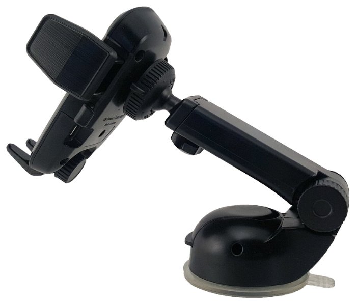 The device is designed specifically for new generation phones (Samsung S10+, iPhone Xs Max) with wireless charging function. Side clips securely hold smartphones from 4” to 6.5”. An extension rod on a rotating platform with one elbow is designed to adjust the extension of the holder. Wireless charging is connected to the base via a 1.2-meter cable.