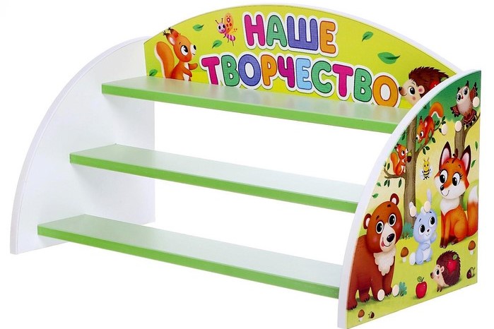 Open shelving for crafts and small toys. It can be used for children's institutions or for the home. There are 3 spacious shelves that allow you to place a large number of parts, crafts, applications. Bright pictures will attract the attention of the child. Dimensions: 30x63.2x37.2 cm. Weight: 2.6 kg. Material: MDF. Average price: 2700 rubles.