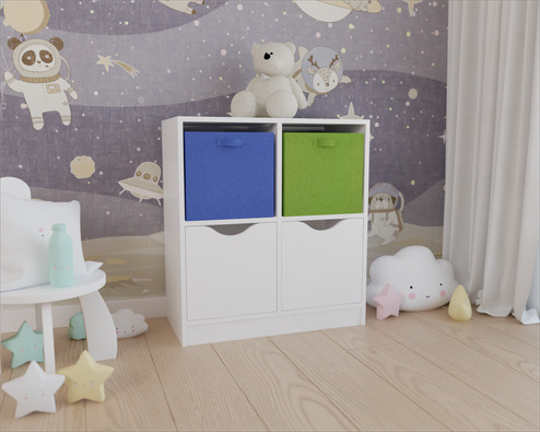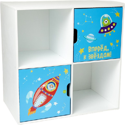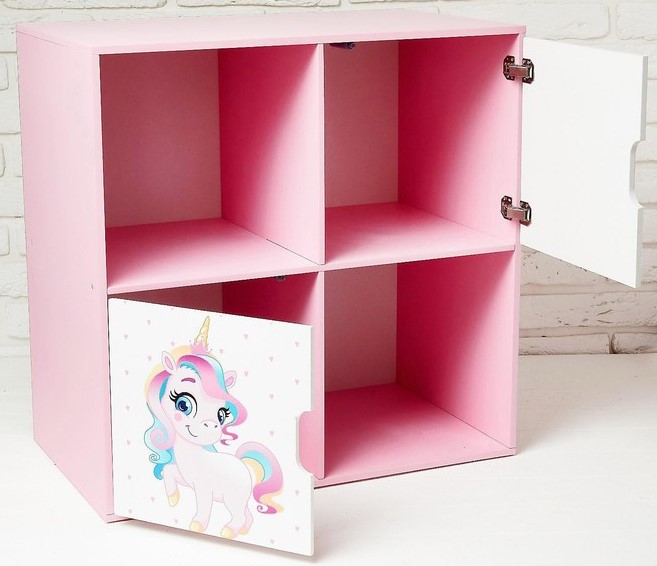 Shelving for toys and other accessories with a cute pony print will appeal to any fashionista. The design has 2 open compartments and 2 closed drawers. If desired, rag baskets or plastic boxes can be placed in the open compartments. Dimensions: 60x35x60 cm. Weight: 11.5 kg. Cost: 5390 rubles.