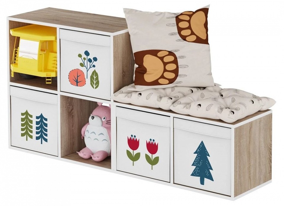 Children's toy book racks are suitable for children of different ages. Model with a practical mattress and cushions with Velcro, made of soft wear-resistant velor. Body material: chipboard. Textile boxes are not included, if desired, can be purchased separately or used as an open type model. Cost: 7290 rubles.