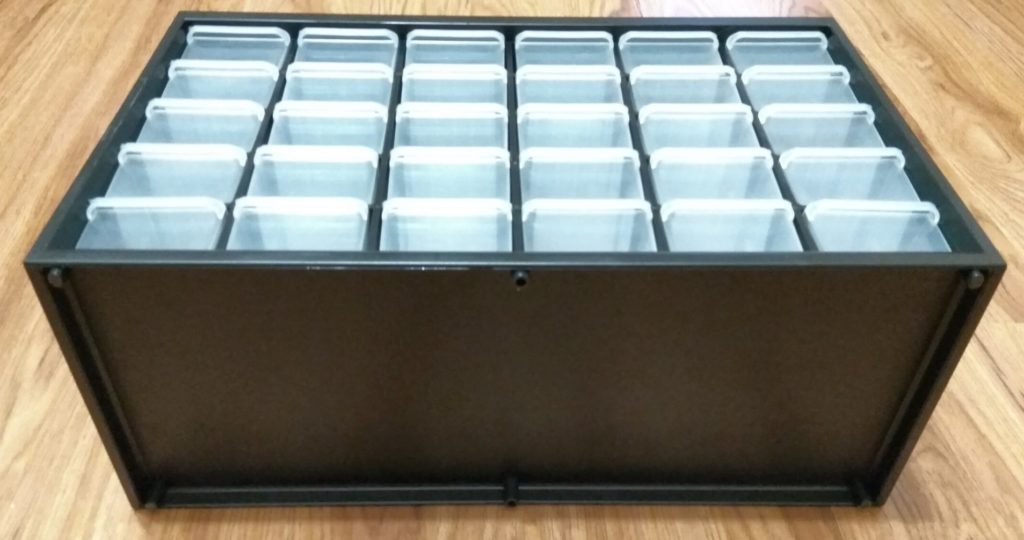 Plastic rack for children, with a large number of compartments. It is convenient to store Lego parts or small toys in it. Assumes only horizontal storage, sections without fasteners, when moving, they can move forward. Dimensions: 15.5x36.5x22.5 cm. Weight: 1 kg. Rack color: grey. Average price: 2499 rubles.