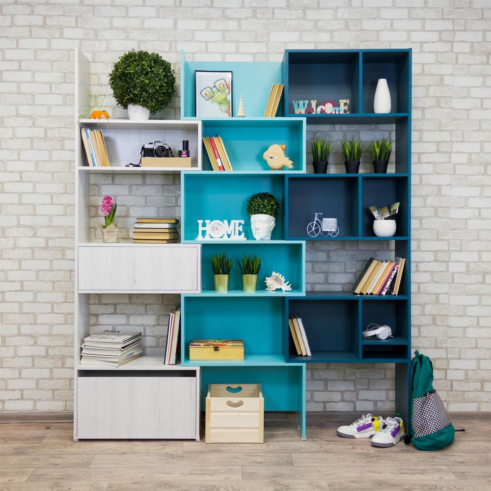 Shelving cabinets from a well-known brand and have wide functionality. Hold a large number of items (books, toys, stationery). Thanks to the back wall, nothing will fall or get lost. The complete set includes 2 open and 2 closed compartments. Cost: 5554 rubles.