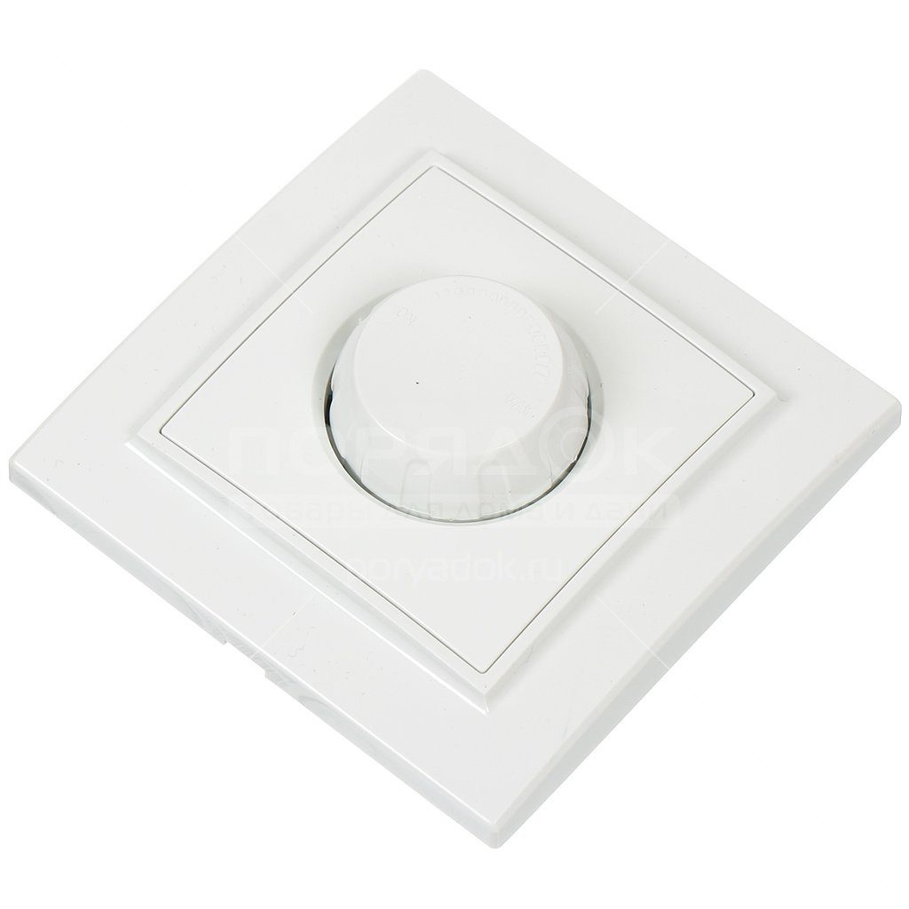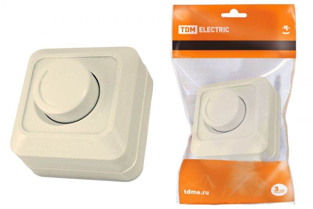 Embedded device from a Spanish manufacturer. Suitable for 200V incandescent, halogen and LED lamps. Swiveling design - control and dimming is carried out by a smooth turn of the knob. Three-wire connection scheme.
