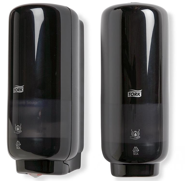 Tork makes a touch-sensitive wall-mounted dispenser that is perfect for bathrooms in any office. The model of a strict rectangular shape in black color is made of durable plastic. Its size is 28x11x13 cm.Built-in frother delivers a small amount of soapy mousse, enough for a thorough hand wash.