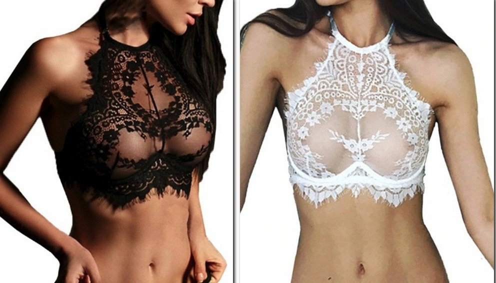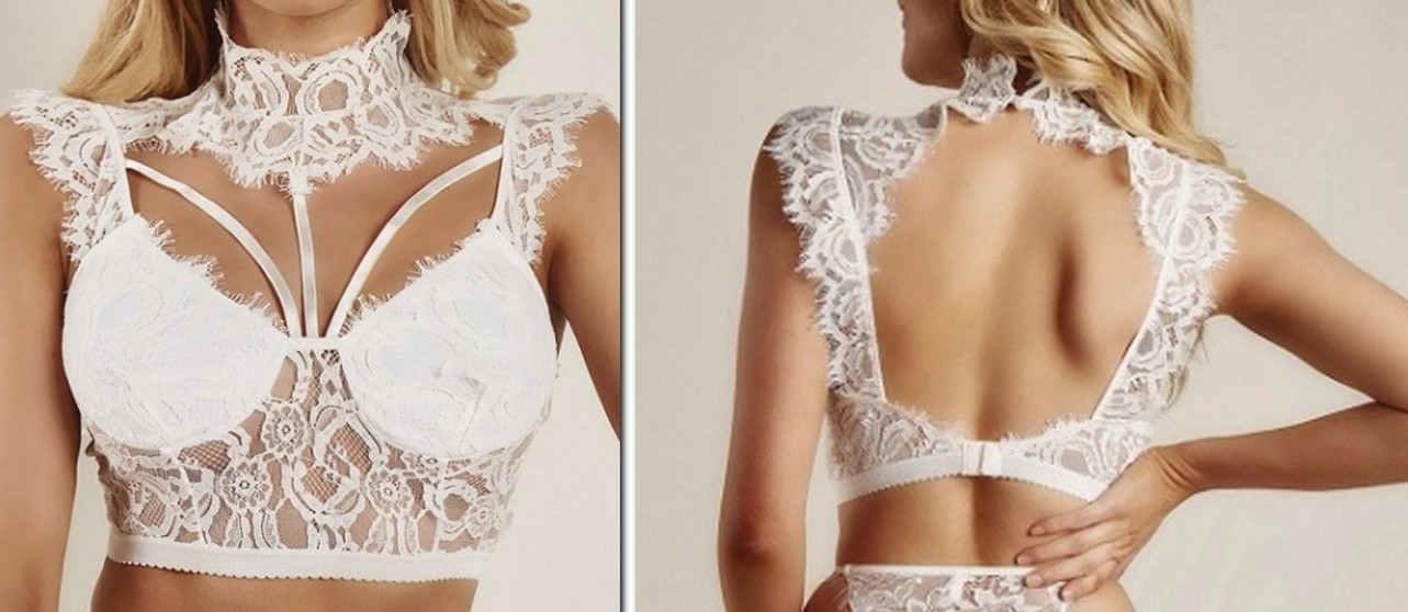 Erotic lingerie in the form of a top. The chest is only supported at the bottom. The bra fastens in two places: on the neck and back. The material is translucent, with lace patterns. In the summer, you can wear the product under a jacket.
