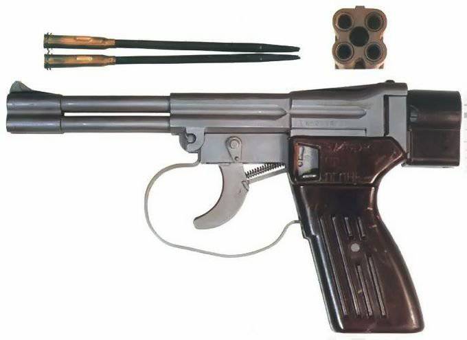 Excellent underwater pistol - simple, compact and reliable. The harpoon is inserted into the barrel, the shutter is retracted into the magazine, designed for 4 capsules. Charges are inserted, the bolt closes, the hammer is cocked and the gun is ready to fire.