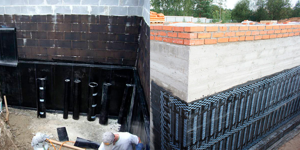 Their complexity lies in the fact that the layer must not only protect the structure from water, but also prevent groundwater from entering the basement.The use of various waterproofing materials will depend on the depth of the foundation and the level of passage of ground flows. In very simple cases, it is possible to use a profiled membrane based on polymers, and for the interior treatment of the basement, use coating compositions. A profiled polymer-based membrane can also protect the base from tree roots, sharp fragments of construction debris, while simultaneously performing a drainage function. It is impossible to ignore the above-ground elements of the foundation. When processing them, the environmental conditions must be taken into account. For a temperate climate, coating insulation with impregnating bitumen-polymer mastic is suitable. And in a harsh climate, which is characterized by sudden changes in temperature, it is preferable to do the processing by pasting with rolls or using a penetrating method - all this will significantly increase the strength of the base.