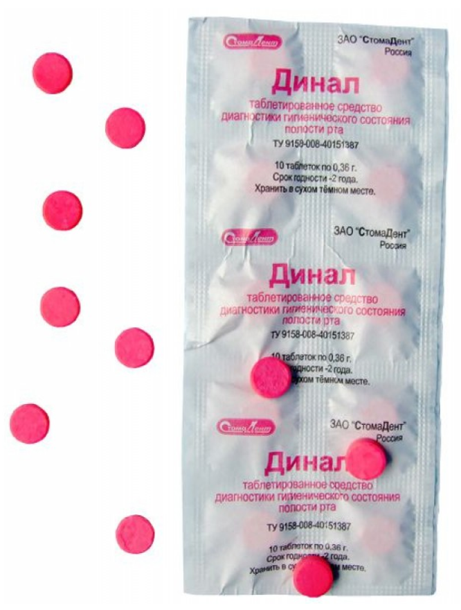 The product is presented in the form of pink tablets. There are ten of them in one pack. Dental plaque is stained with a light red tint. The taste of the drug is sweet, vanilla. The coloring agent is erythrosin. The cost of Dinal tablets in a pharmacy is a little more than two hundred rubles.
