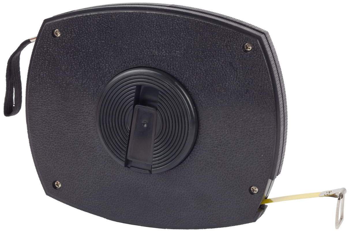 Ten meter fiberglass tape. Closed plastic case. Small plastic handle for mechanical winding, folds into the body. The hook is a plastic ring.