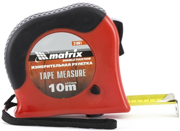 A ten-meter steel tape, 25 mm wide, is covered with a sewn-in polymer anti-corrosion layer. The plastic case is partially covered with a rubber layer. Two separate buttons for fixing the canvas. Equipped with a metal hook and a comfortable strap.