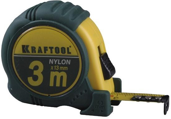 Steel measuring tape, 19 mm wide and 3 m long, nylon coated. Wound in a rubberized case. For the hook, a steel tongue is used, in which there is a hole for measuring the wire. The body simultaneously serves as a stencil for drawing a circle. The latch is a plastic button.