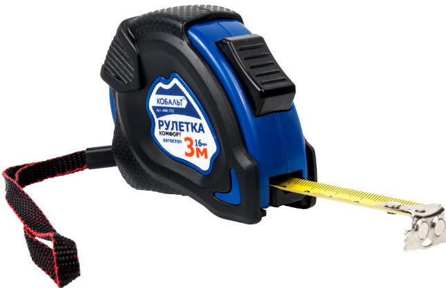 The three-meter strong tape, 16 mm wide, is made of the tempered carbon steel. The case is shock-resistant and consists of two components - plastic is covered with rubber and an anti-slip coating. The tool is equipped with a sliding latch, a quick stop button, a metal hook.
