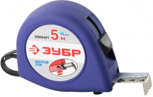 Five-meter tape, 19mm wide, with a metal hook. The body is covered with rubber coating. In addition to the latch, there is a quick stop button.Complements the tool with a small comfortable strap.