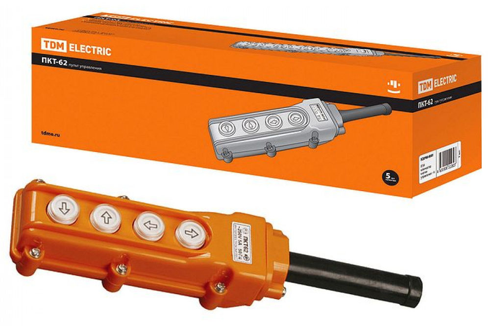 The model has 6 controls - "forward", "backward", "left", "right", "up", "down". The design is similar to other similar products (there is a sealed gasket that seals the stuffing box). The device is used for switching any mechanisms equipped with an electric motor.The plastic is heat resistant. Body color - orange, pushers - white. Rated frequency - 50 Hz. Operating voltage: direct - up to 400 V, variable - up to 660.
