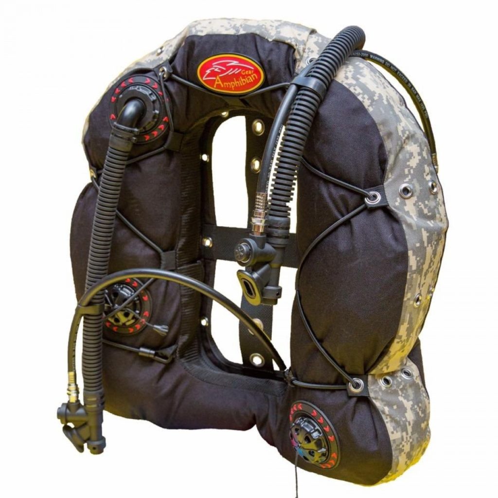The model is made in the form of a vest. Independent cameras can tailor uniforms to the individual characteristics of the structure of the human body. Special stabilizers for the cylinder keep it in the right position, so the diver does not feel discomfort during swimming. Made from nylon coated polyurethane.