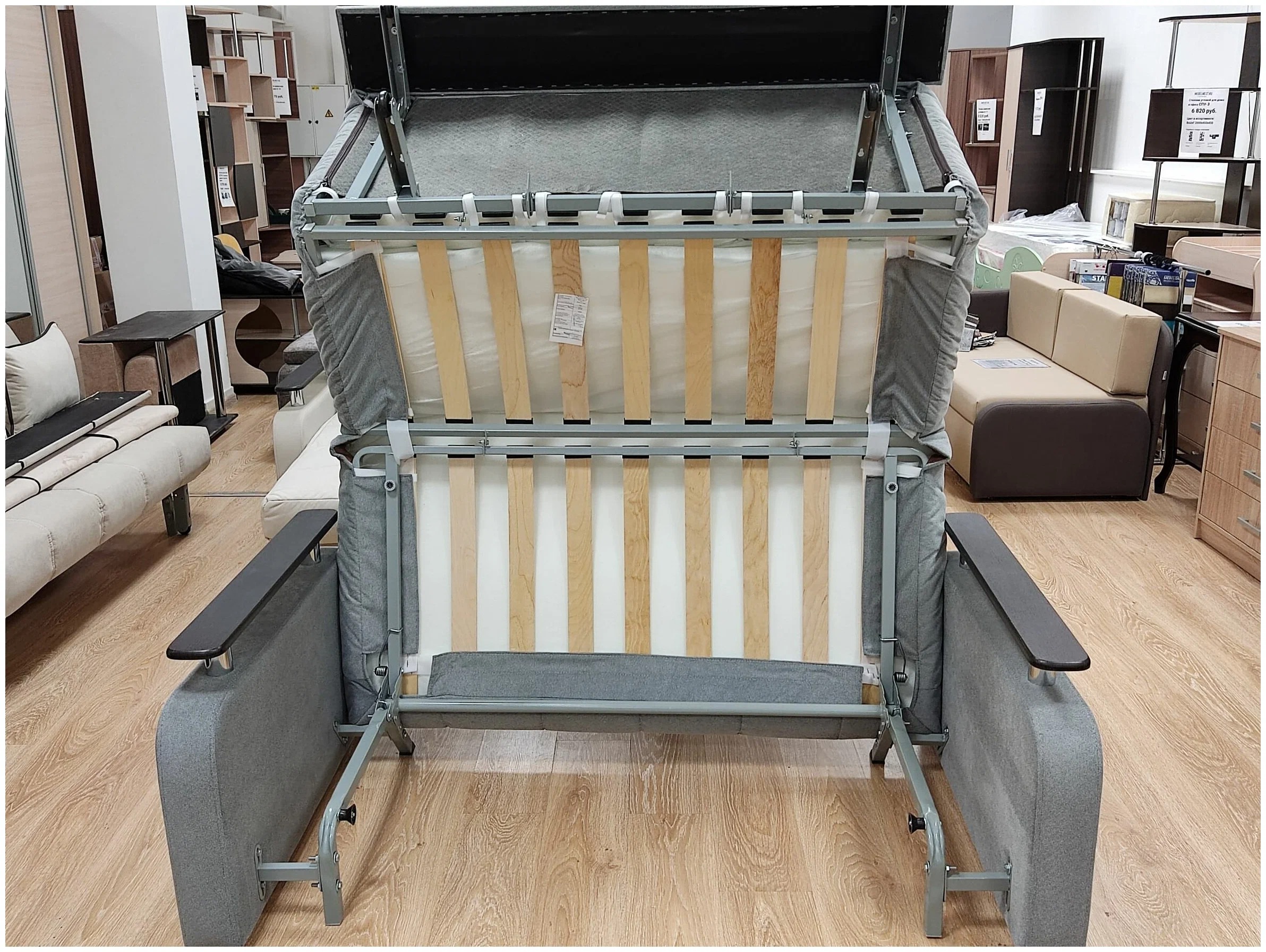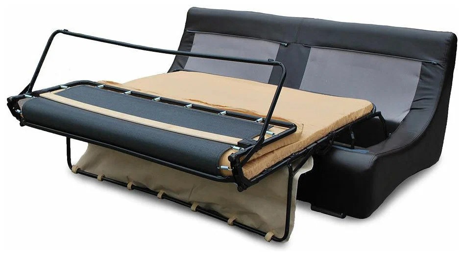 - French foldout. The design is divided into several sections hidden inside, the bed is moved forward and fixed with legs. A similar system is in the American and Belgian clamshell or sedaflex as in the presented photo.