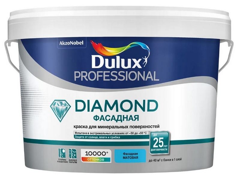 After processing, the paint forms a breathable coating. Protection is provided up to 15 years. Contains active additives against the formation of algae, fungus and mold. Has resistance to fading and high vapor permeability.Diamond technology combines the environmental friendliness of a water base and the strength of an alkyd coating. Successfully resists precipitation within half an hour after application. Suitable for mineral and wooden substrates. The recommended cost for retail chains is 4848 rubles.