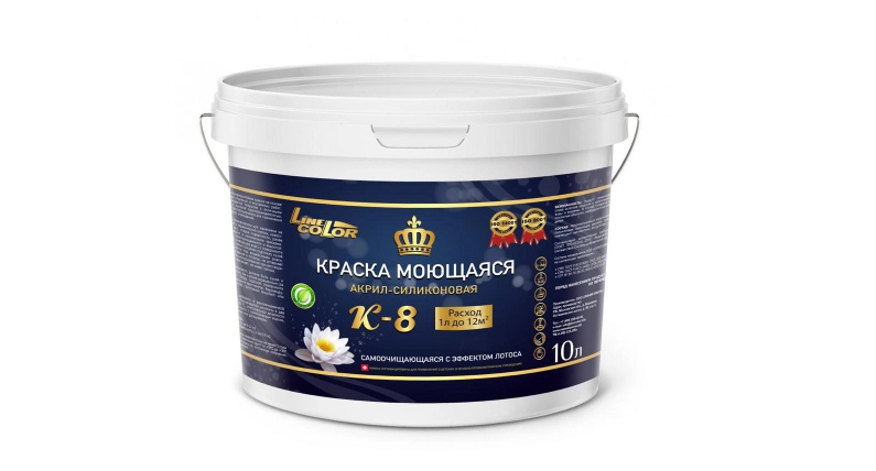 Producer: LLC LINE KRASOK LINE COLOR. Acrylic-silicone emulsion, suitable for outdoor and indoor use.Work surfaces: concrete, wood, brick, plaster. Cost: 2350 rubles.