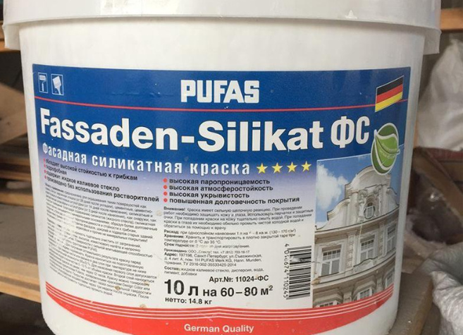 Retains a presentable appearance for 5-7 years. Does not fade when washed. Withstands temperature fluctuations. Apply to plaster, brick, concrete. Average cost: 1150 rubles.