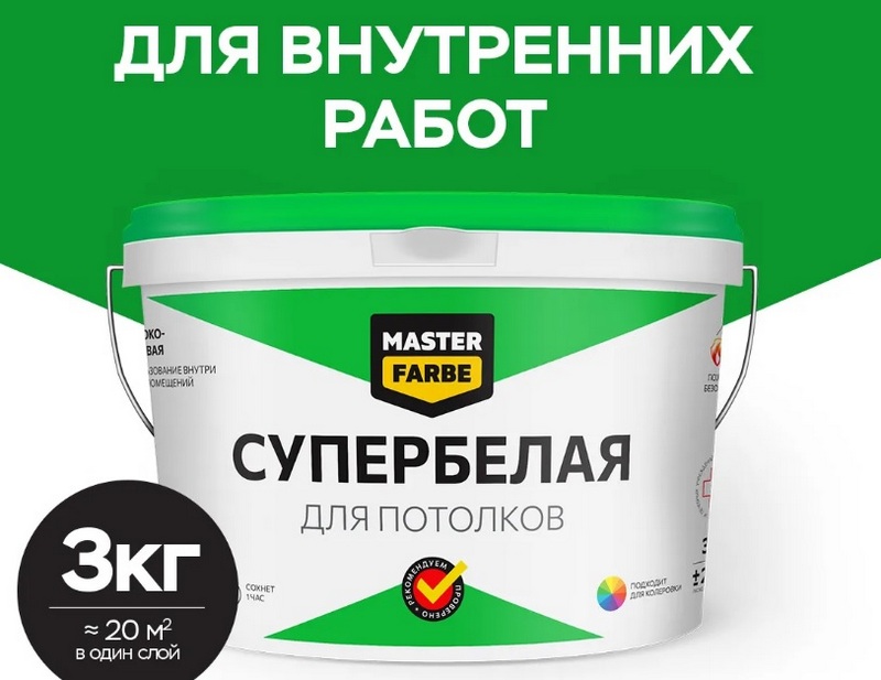 The sample is used for painting ceiling surfaces made of concrete, drywall, chipboard, fiberboard in residential and other dry areas. Color is super white. The composition is characterized by environmental friendliness - it has no smell. Diluted with water before use. Certified for children's and medical institutions (confirming document RU.01.PA.02.015.E.000715.07.20), fireproof (fire hazard class KM1). The recommended cost for retail chains is 486 rubles.