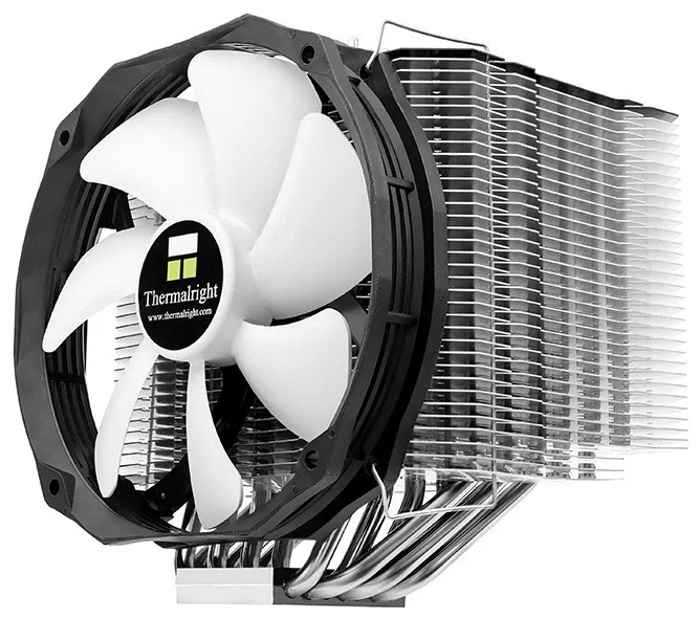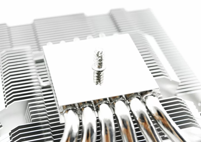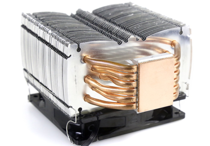 A versatile tower-type product capable of operating in passive mode. Despite the dimensions, it can be easily placed on any motherboards without overlapping the upper slots due to the asymmetric shape. The composition includes a radiator with seven nickel-plated tubes, on which 35 aluminum plates are strung with a total dissipation area of almost 12,000 sq.cm.