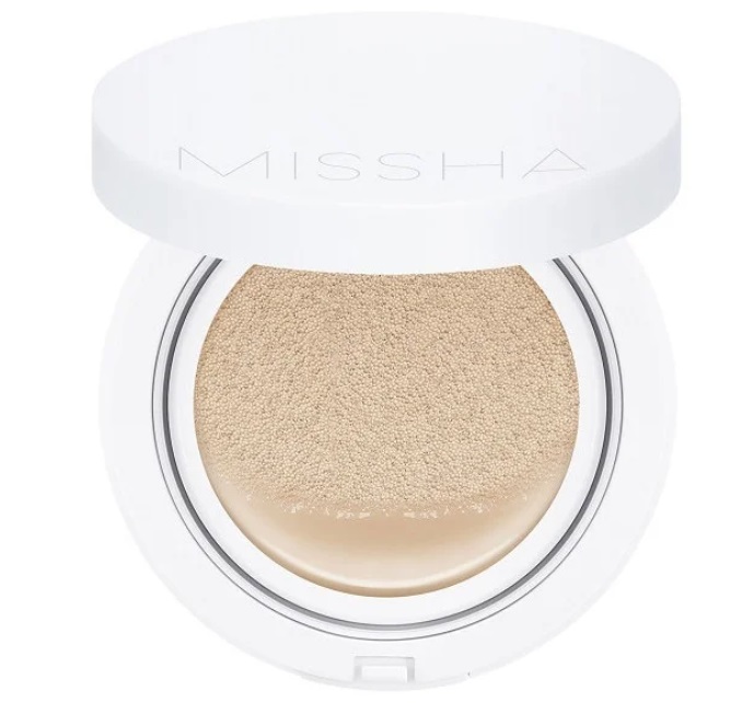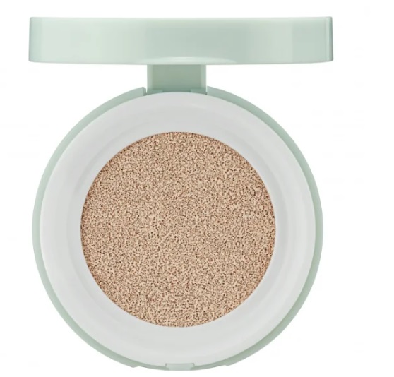 An inexpensive cushion from South Korea contains niacinamide, chamomile extract, centella asiatica, which relieve inflammation, regenerate damaged epidermis and narrow pores. Macadamia nut oil and adenosine control the secretion of sebaceous glands and prevent the appearance of oily sheen. Cucumber juice maintains moisture balance.