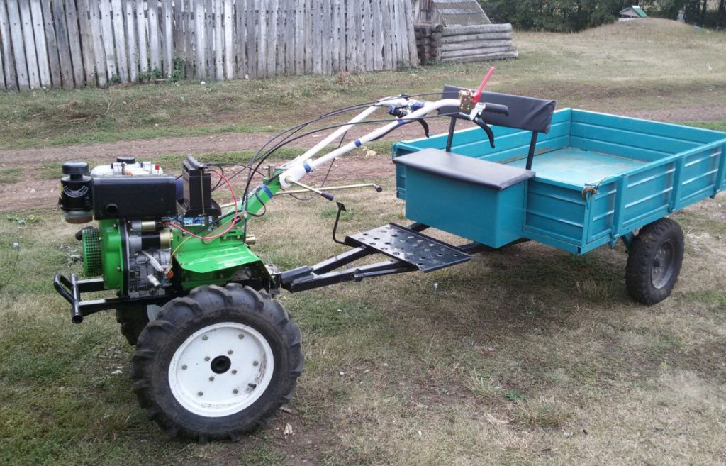 The walk-behind tractor is capable of carrying loads that exceed its own weight twice. Engine power and mass is enough for such a difficult task. It is often used as a mini tractor, as it is able to do its job, but costs an order of magnitude less. The trailer for it is sold separately in the store, but some craftsmen make their own from improvised means. It is very popular with summer residents and owners of medium-sized farms due to its versatility.