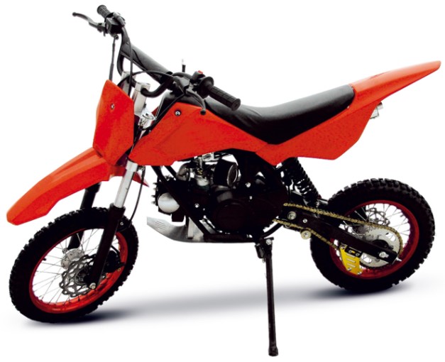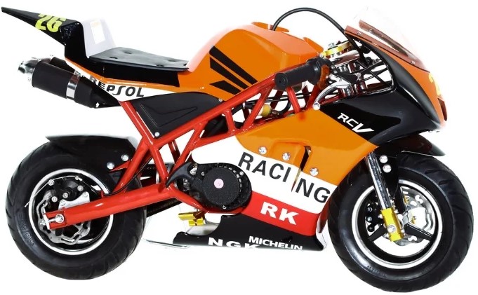 Sports bike for road use for professional activities. Suitable for the spring-summer period on open areas or indoor motorcycle tracks all year round. Small in size. Suitable for small girls. Orange design. Sitting plastic, is located horizontally. The tank is used to hone various elements: cornering, for example.